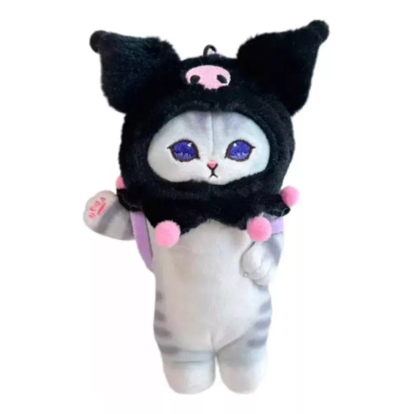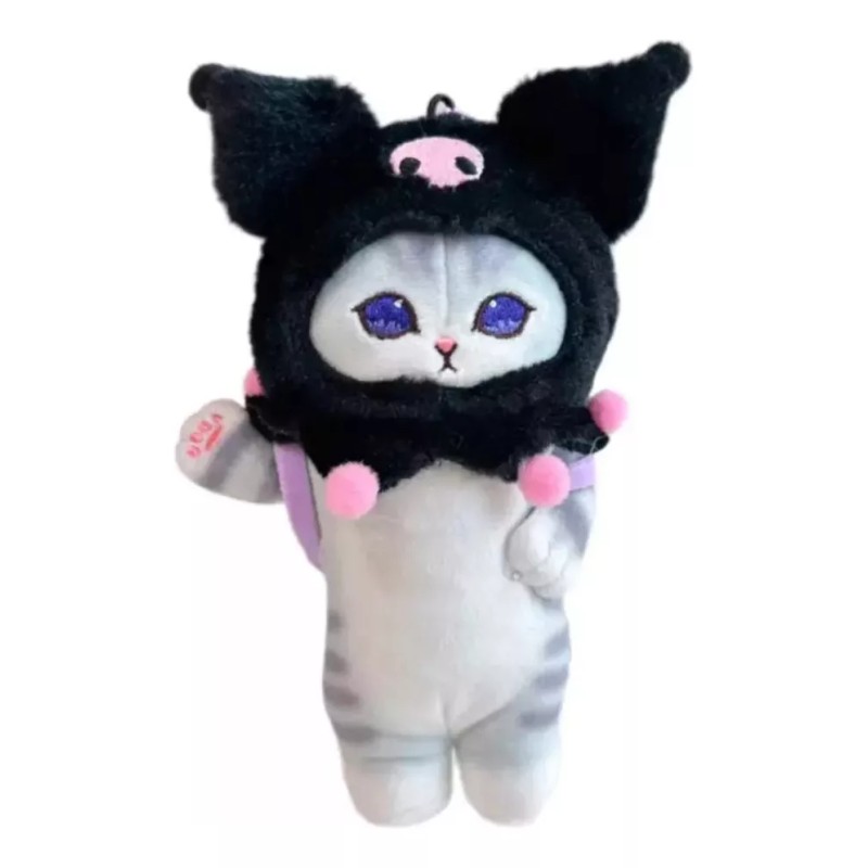Llavero de peluche gato con disfraz de Kuromi, es pequeño, mide 18.5cm de alto.