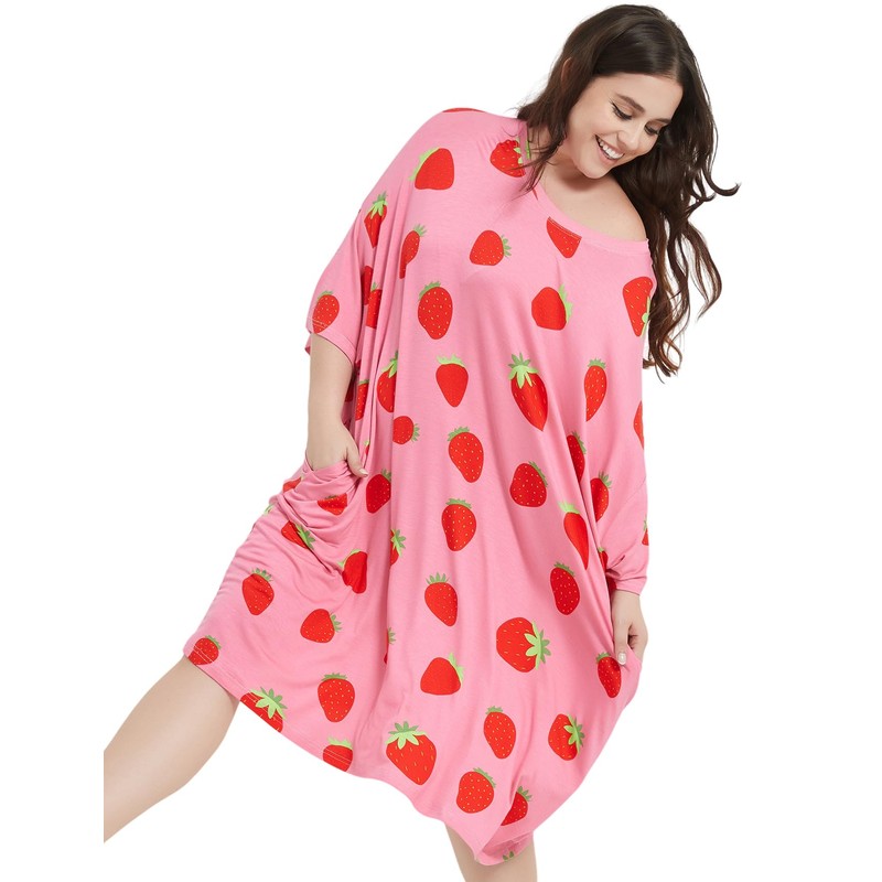 KFUBUO Plus Size Nightgowns for Women Oversized Sleep Tshirts Dress Pjs Lounge Short Sleeves Strawberry Sleepwear With Pocket Fit S-5XL