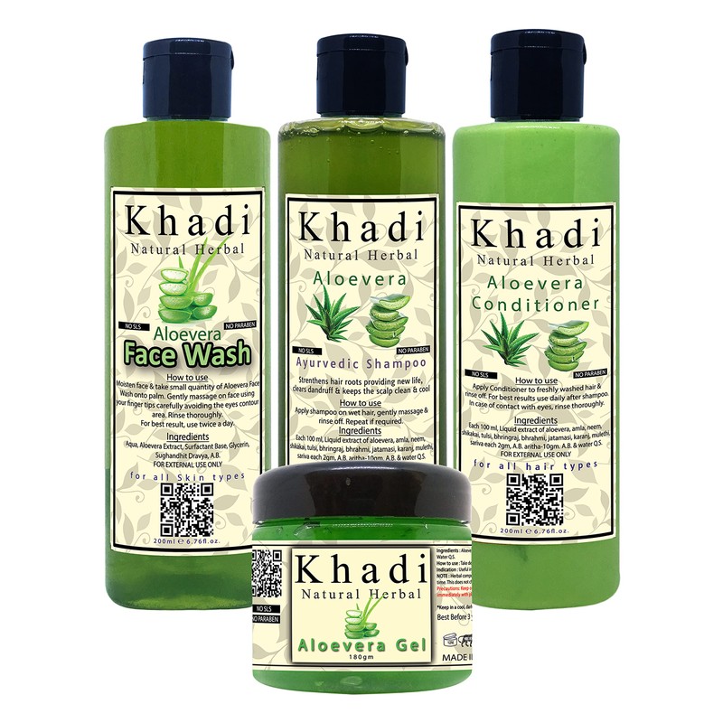 - Khadi natural herbal aloevera Bathing kit contains Aloevera Shampoo, Aloevera Hair Conditioner, Aloevera Face Wash and Aloevera Face Gel.