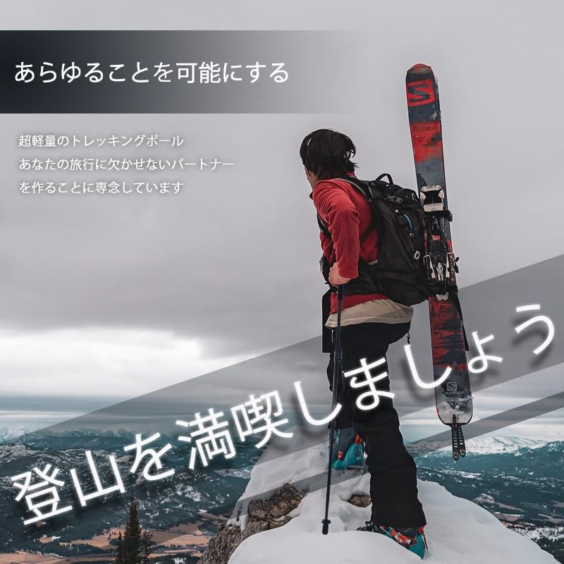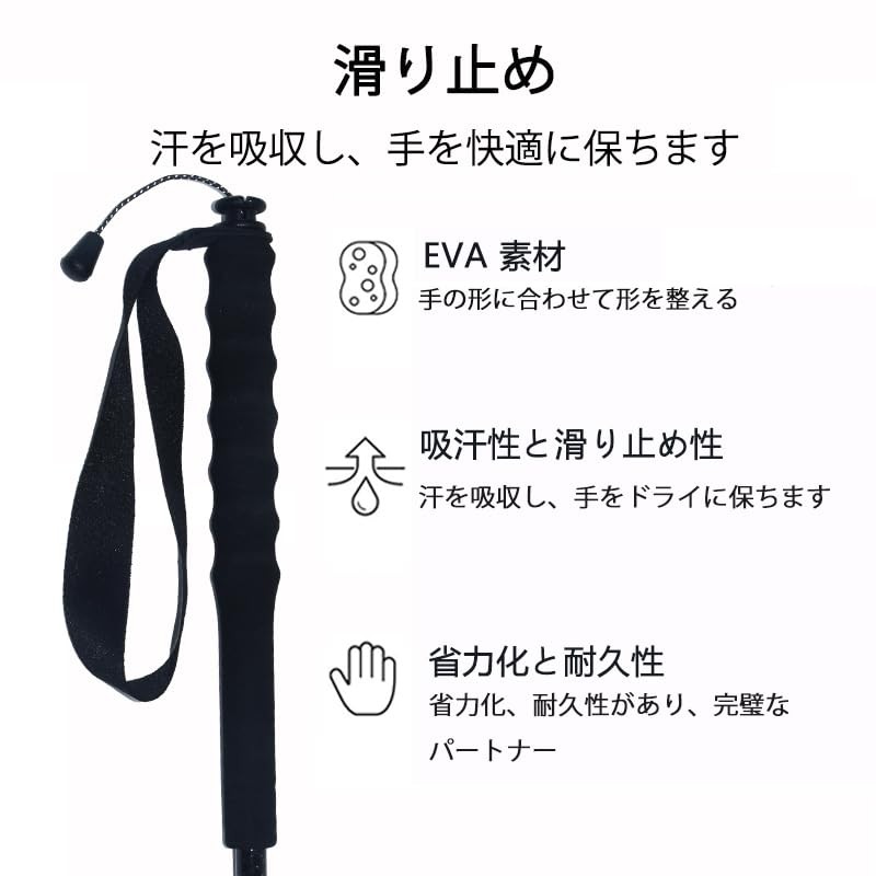 - 快適グリップ&ショック吸収:高弾性EVAグリップで握り心地が良く、汗をかいても滑りにくい。カーボンボディのショック吸収効果で、腕や体への負担を軽減し、快適なトレッキングをサポートします。