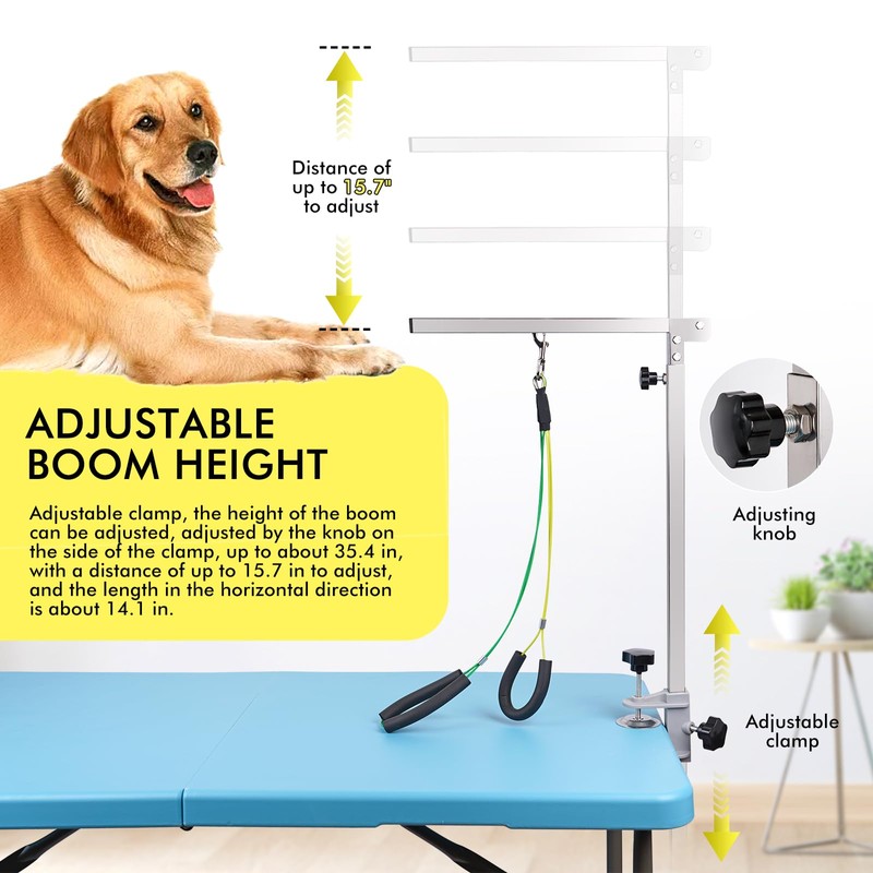 - The height-adjustable and detachable arm is a multi-function tool that can be adjusted with clips to accommodate pets of different sizes. It can also be detached and clipped to other matching tables if desired, and two grooming rings are attached to the arms to protect your pet during grooming activities such as bathing, drying or trimming.
