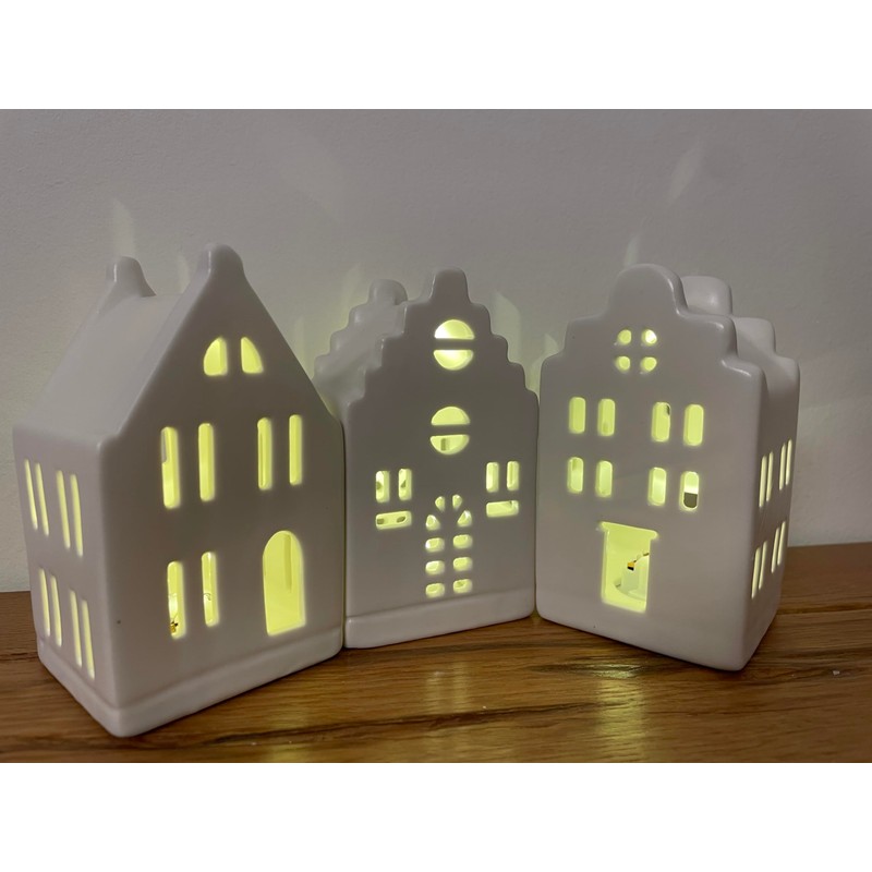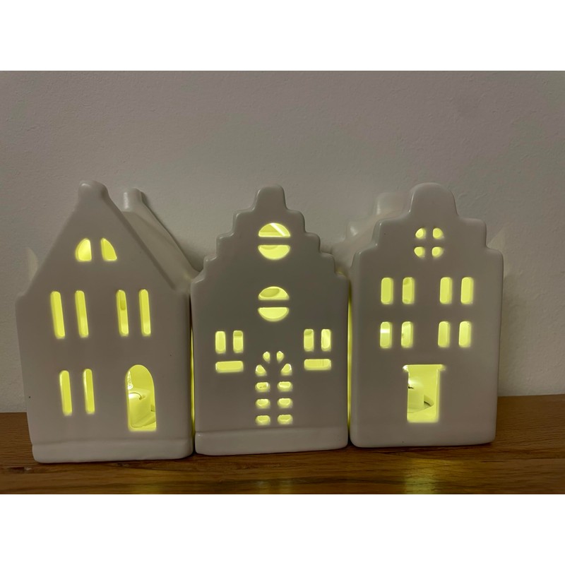 - Immerse your home in the festive atmosphere of the holidays with our enchanting set of 3 Christmas decoration LED houses with timer (6 hours on, 18 hours off) made of white ceramic. These adorable light houses are a perfect addition to your Christmas decoration and add a cozy and festive ambience to your living space.