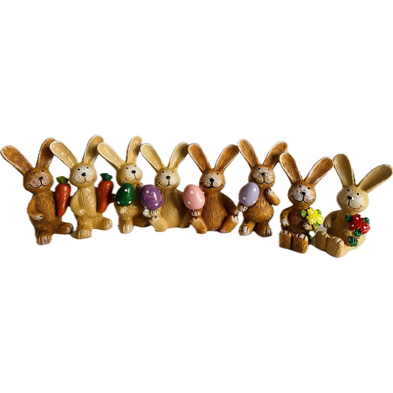 - 8 LOVELY DESIGNED FIGURINES - The set consists of eight unique rabbits that hold either colourful eggs or carrots in their hands. With standing and sitting positions, they bring variety and variety to your rabbit decoration.