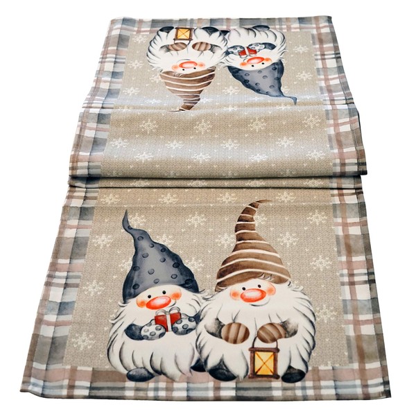 - Christmas Motif The Christmas table runner is completely printed with a winter motif. It features two cute gnomes on a snowflake background.