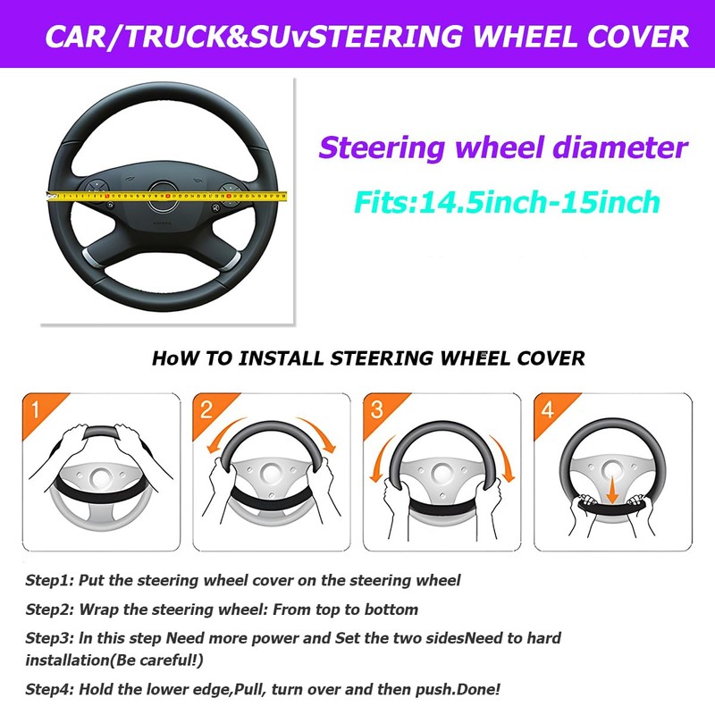 - Convenient to Use: This car steering wheel cover is easy to install. First of all, you should place the top end of the car steering wheel cover on the top position of the car steering wheel. Next, you need to press the top part of the steering wheel and gradually tighten it with both hands towards the bottom of the steering wheel on both sides. Finally, you just need to adjust it a little bit to cover the steering wheel firmly to complete the installation.