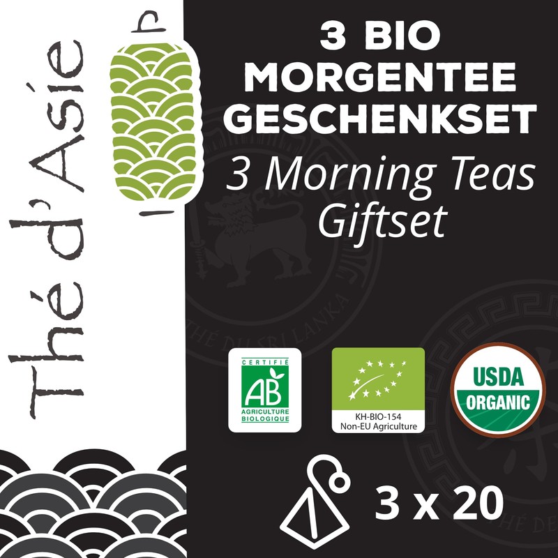 - Asian morning tea trio - Embark on a tempting journey through Asia with our trio of morning teas specially designed for a good start to the day. This selection presents 3 distinctive organic teas: Chun Mee Green Tea, Breakfast OP Black Tea and Earl Grey Tea. They are packed in practical tea bags in a beautiful gift box and are perfect for giving as a gift or for your own enjoyment.