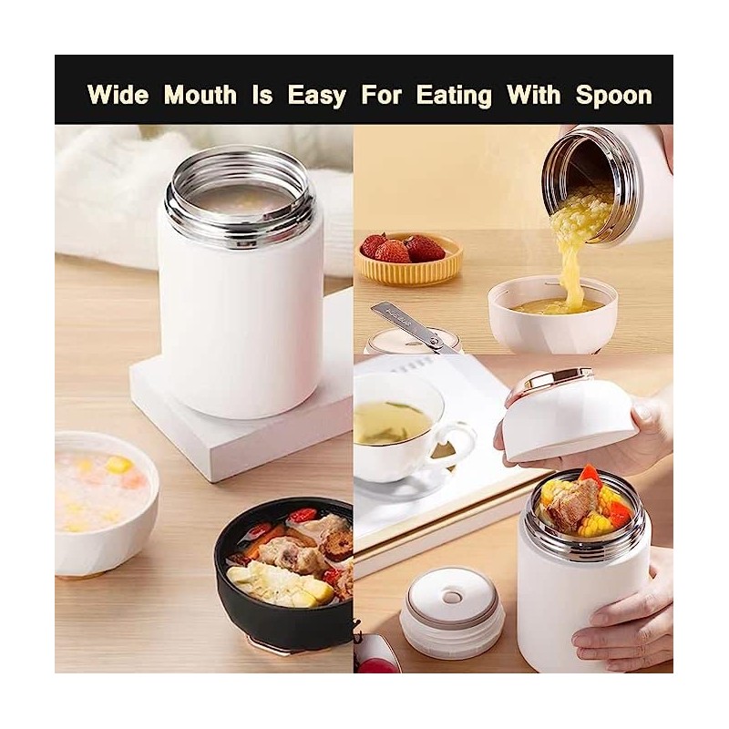 Khobisoft Food Flask With Folding Spoon, 600ml (20oz) Stainless Steel Jar for Hot and Cold Meals Double Walled Soup Flask Leakproof Food Jar Soup Containers (white)