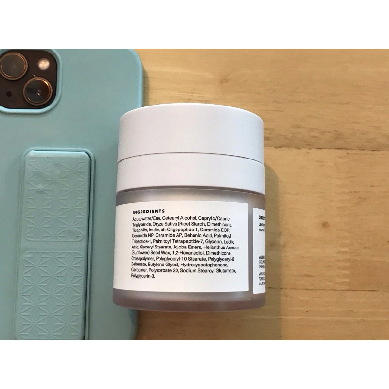 - Ingredients: Water, Cetearyl Alcohol, Caprylic/Capric Triglyceride, Oryza Sativa, Dimethicone, Ticaprylin, Inulin, sh-Oligopeptide-1, Ceramide EOP, Ceramide NP, Ceramide AP, Behenic Acid, Palmitoyl, Tripeptide-1, Tetrapeptide-7, Glycerin, Lactic Acid