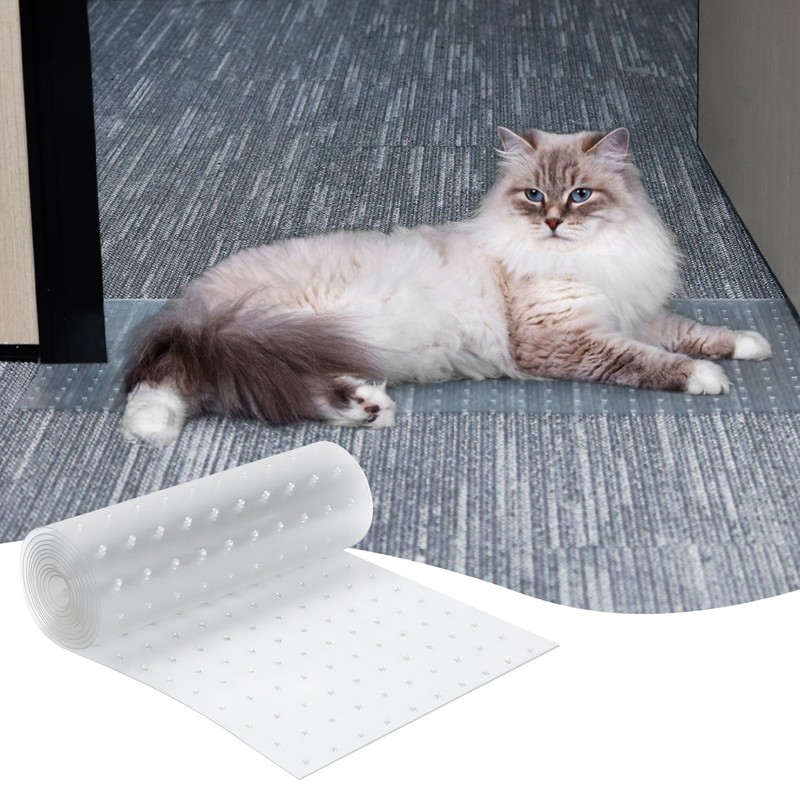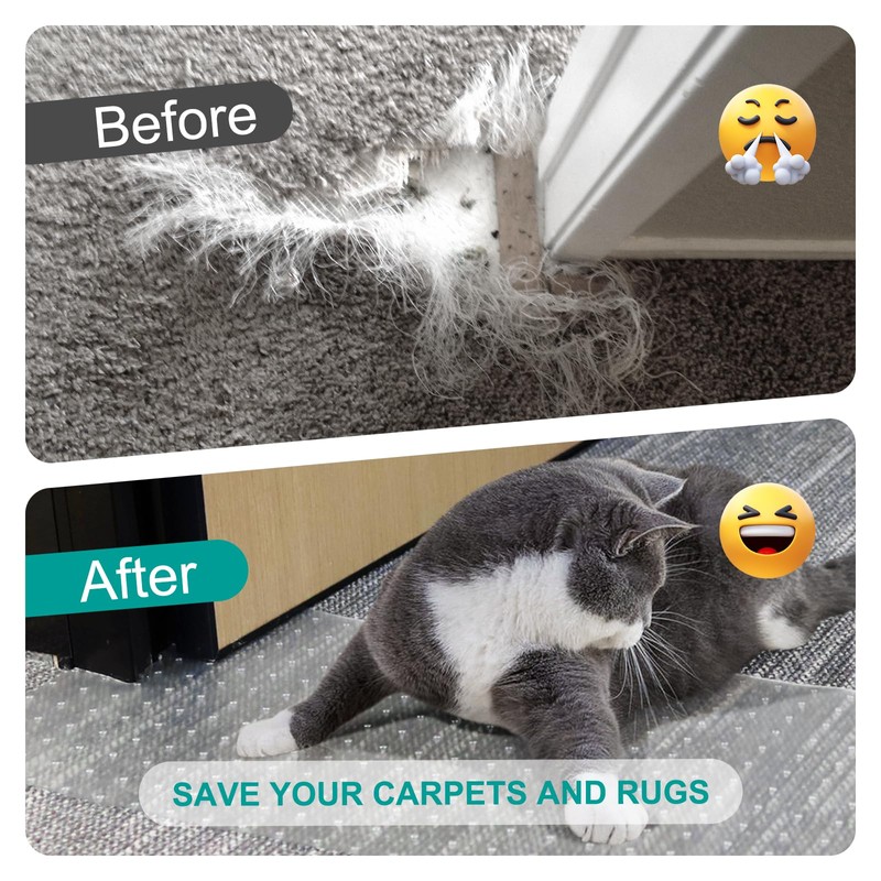 - Plastic Clear Carpet Protector - The carpet protector mat is made of high-quality material PVC plastic, which is durable, reusable, recyclable, and strong, so your cat can't scratch the carpet. It will protect your carpet for a long time and save you the cost of replacing the carpet.