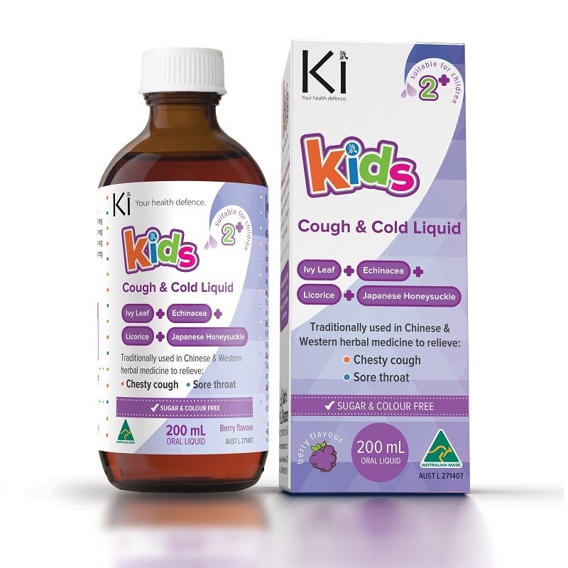 Ki Kids Cough & Cold Liquid combines 4 natural active ingredients to help relieve symptoms of the common cold, including chesty cough, sore throat.