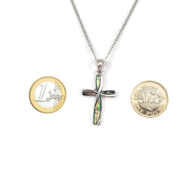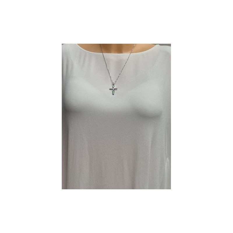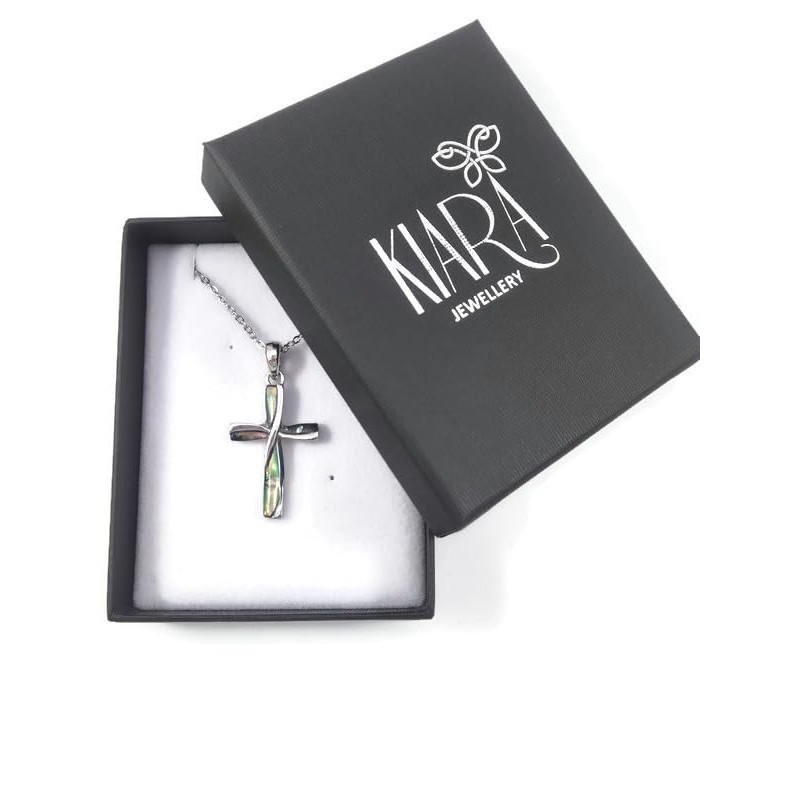 Kiara Jewellery Modern Cross Pendant Necklace Inlaid With Greenish Paua Abalone Shell On 18"/20" Trace Chain.