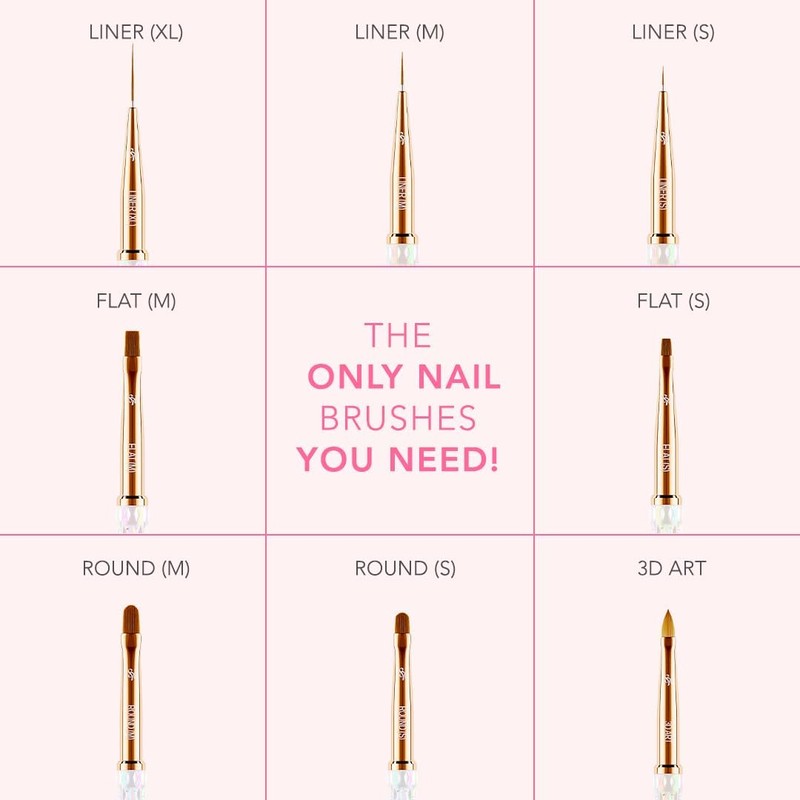 - Flat S: versatile brush that can be used for anything from builder gel, to blending ombres, to painting nail art such as flowers and more! It's perfect size and shape makes clean up on smaller nails effortless