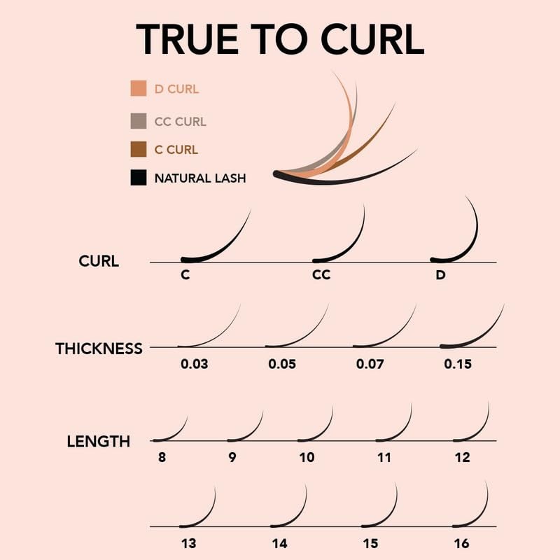 - True to Curl with no kinks!Our lashes stay true to their curl, available in C, CC, and D options, ensuring each lash extension retains its beautiful curve. Each lash is meticulously designed to ensure no kinks, maintaining a flawless, uniform appearance throughout each set.