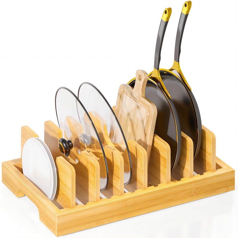 Kiasthome Bamboo Pot and Pan Organizer, Pot Lid Organizer Holder Rack for Countertop Drawer, Kitchen Cabinet Organizer with 7 Adjustable Dividers for Pots, Pans, Baking Sheets, Cutting Boards, Nature