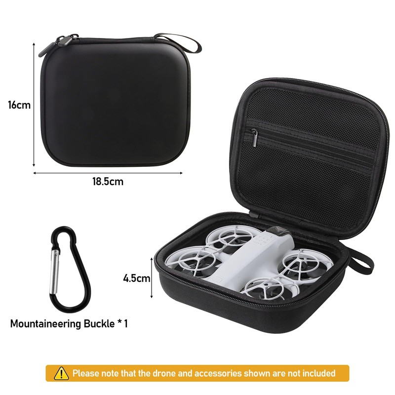 • The packaging includes:The package includes the DJI Neo drone carrying case and a mountaineering buckle for convenient attachment. Please note that the drone and accessories shown are not included