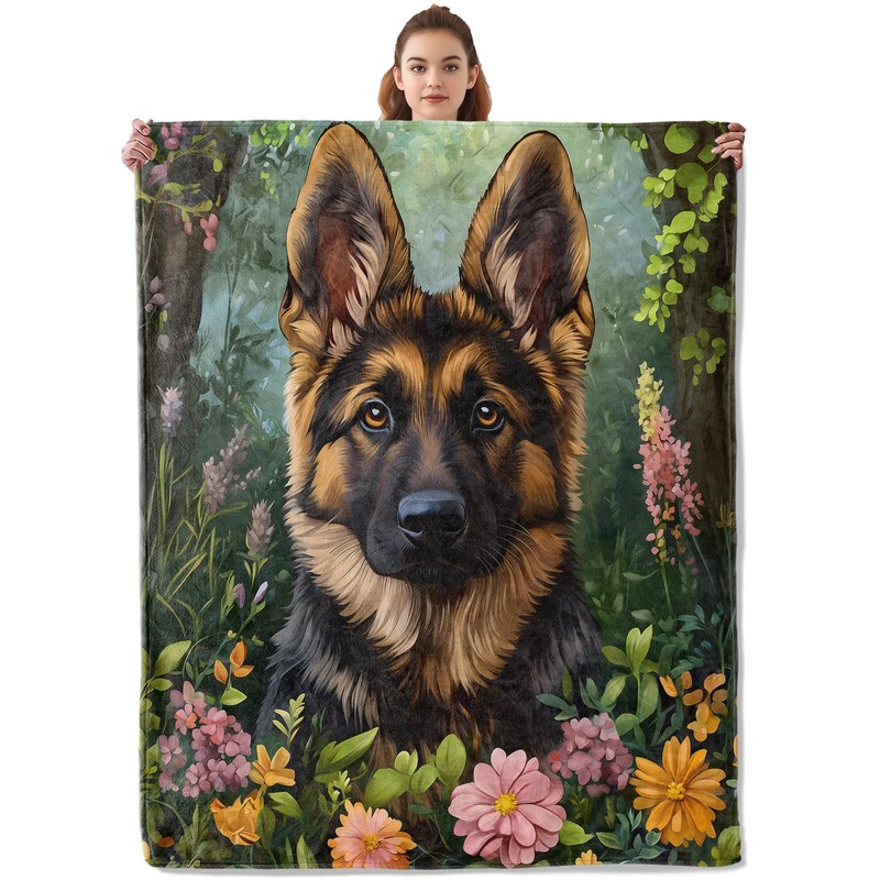 Kibue Cute German Shepherd Dog & Flowers Blanket - Soft & Cozy Warm Flannel Throw, Lightweight Plush Blankets for Travel, Sofa, Bedroom, Office - Gifts for Women Adults Kids - for All Seasons 60"×50"