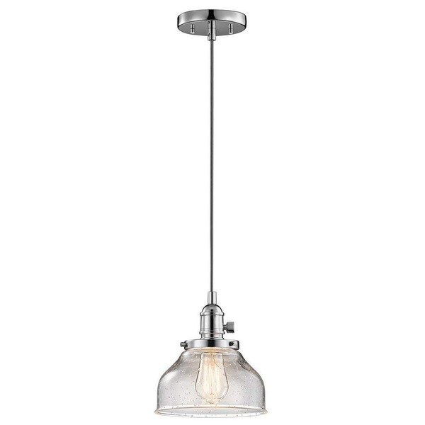 The Avery 8.5" 1 light bell mini pendant features a classic look with its Chrome finish and clear seeded glass. The Avery mini pendant comes equipped with adjustable cording and working paddle switches to turn the light on/off if you wish. Presenting a neutral style, the Avery bell mini pendant works in several aesthetic environments, including transitional and vintage industrial.