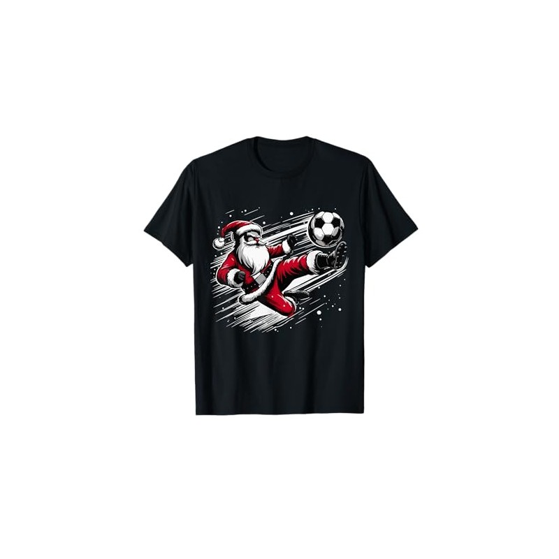 - Celebrate the holiday season with a twist! This eye-catching design features Santa Claus in an energetic pose, kicking a soccer ball with flair. Dressed in his iconic red suit trimmed with white fur,