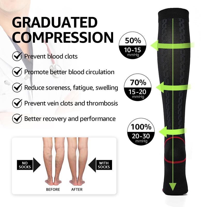 • Lab tested "Gradient Pressure Decrease": Kickticks Compression Socks apply pressure in the right place by creating a "Gradient Pressure Decrease" that is more ergonomically designed to improve movement comfort, effectively relieving fatigue, soreness, circulation, and greatly reducing the risk of calf cramps and even injury.