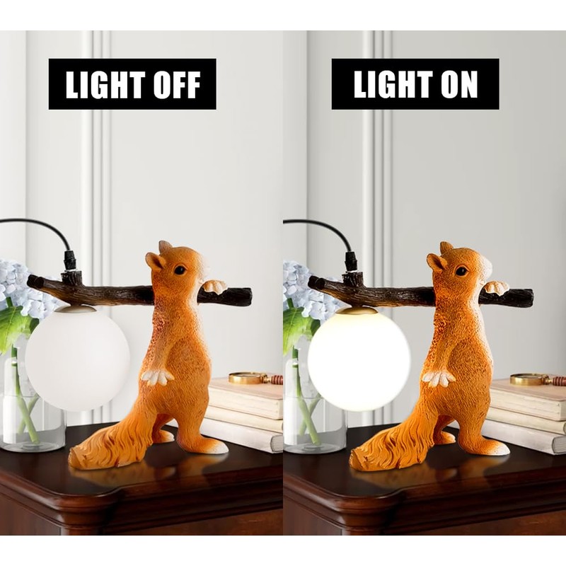 - SIZE and MATERIALS: The total height of the desk lamp is 22.5CM, small and cute. It's not a big desk lamp and won't take up a lot of space; The lampshade is made of plastic, with a semi transparent spherical surface and uniform 360 degree light scattering, providing a good lighting atmosphere; The bracket and squirrel are made of resin, making them durable and stable. Placing it anywhere in the room feels like a work of art, filling the entire room with a lively atmosphere.