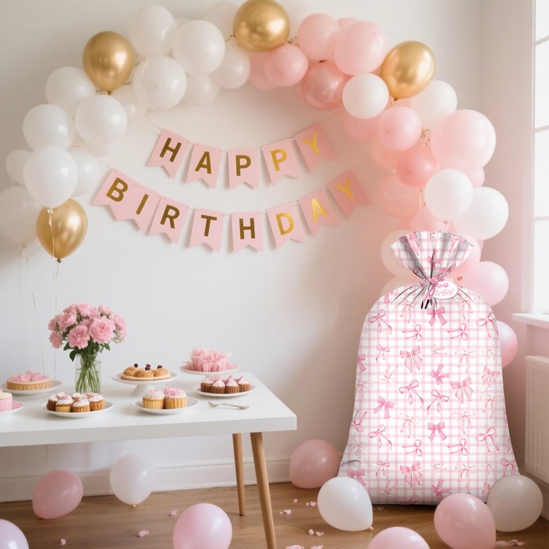 - 「ELEGANT BOW GIFT BAG」Make every gift unforgettable with this oversized 36x56-inch plastic gift bag, featuring a soft pink background adorned with playful pink bows. Perfect for baby showers, birthdays, bridal shower, wedding, bachelorette party, tea party, or any pink-themed partyor special celebrations, its charming design adds a whimsical yet elegant touch to your presents.