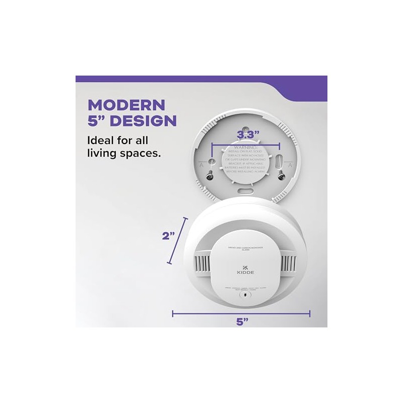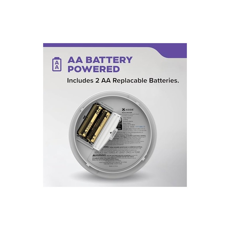 Experience the next level of fire safety with the Kidde Smoke & Carbon Monoxide Detector, AA Battery Powered, Voice Alerts, LED Warning Light Indicators, model 30CUDR-V. This smoke & CO detector has enhanced sensing technology that reduces false alarms often caused by cooking and sends fast alerts that help give your family more time to get out safely. To detect carbon monoxide, an electrochemical sensor is used. This alarm offers a modern 5-inch design ideal for all living spaces such as living rooms, hallways, kitchens, & bedrooms. Voice alerts clearly announce Fire! or Warning Carbon Monoxide! to help identify which hazard is detected. Comprehensively tested and designed to the latest UL standard for safety and reliability, the 5-inch combination smoke & CO alarm is powered by 2 replaceable AA alkaline batteries (included) for continual detection even during outages. Batteries should be replaced every 6 months or when the alarm sounds a low battery chirp. In addition, it's self-testing and easy to install with the included twist-and-click mounting bracket. Meets requirements of 9th Edition UL 217, UL 2034 4th Edition, and FCC. Does not meet requirements for CSFM.