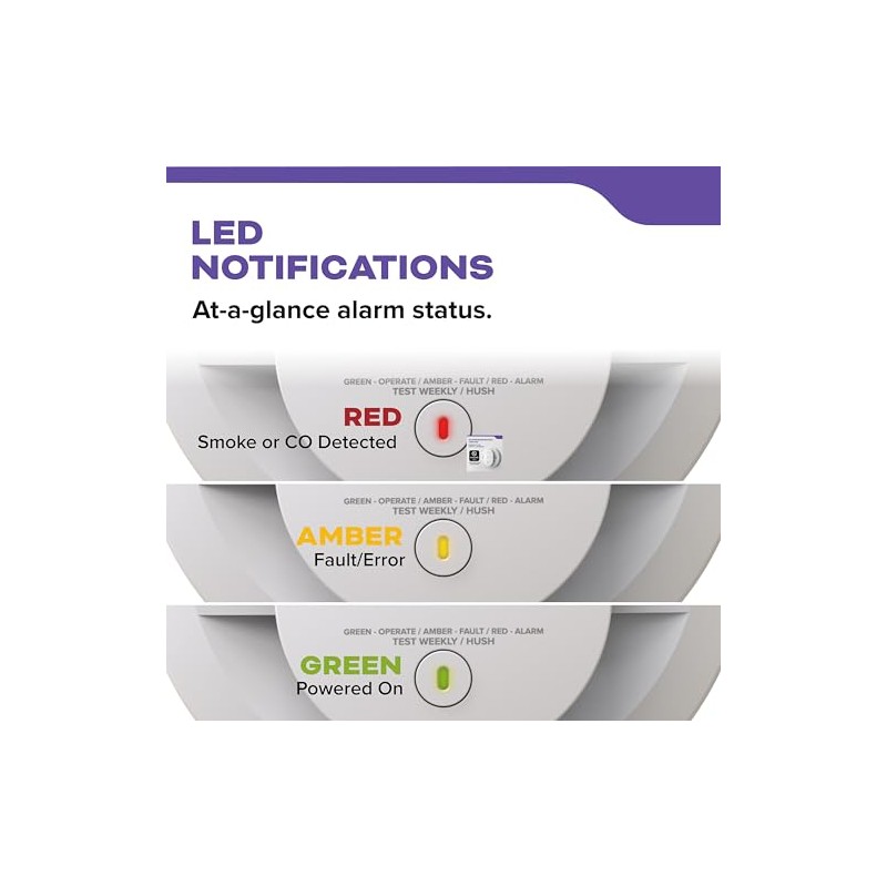 - 3 LED NOTIFICATIONS: LED lights indicate alarm status, green = normal operation, amber = operating error, red = smoke or carbon monoxide detected & a loud 85-decibel alarm will sound.