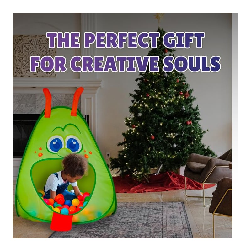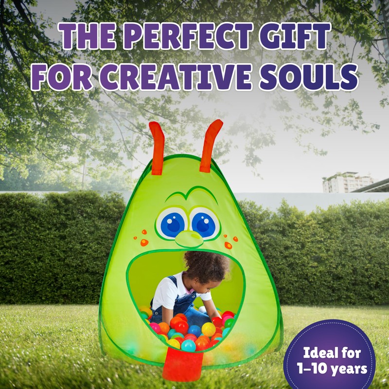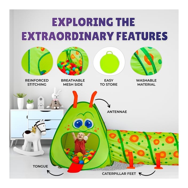 - FRIENDLY ‘BIG MOUTH’ CATERPILLAR – The tent features a fun, smiling, big-mouth caterpillar with tongue and antenna & the tunnel is a long body with legs!