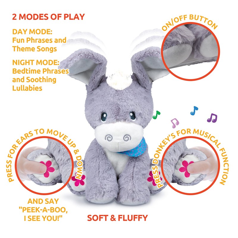 - PLAY PEEK-A-BOO - Turn on this baby musical toy and start having fun! When you press one of the buttons on its feet, the donkey ears move up and down as the toy says "Peek-A-Boo, I see you!"