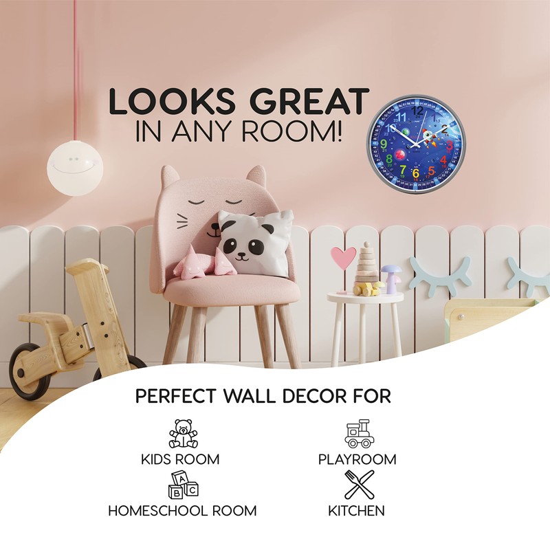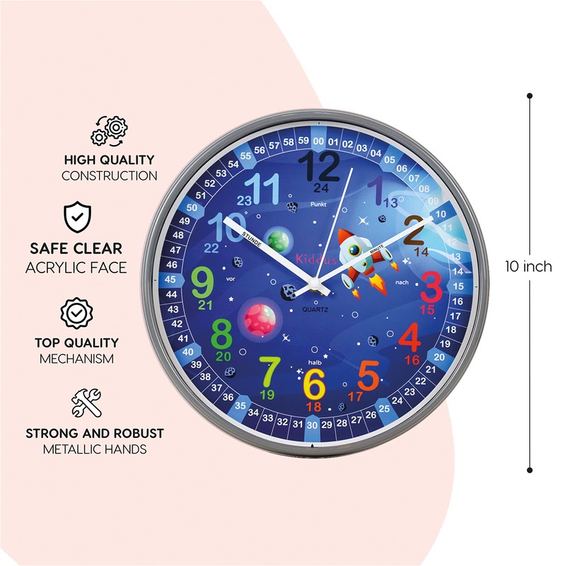 Kiddus Kid’s Wall Clock Analogue Time Teacher with Time Learning Exercises, Silent Clock, Multiple Languages, German, XL Galaxy
