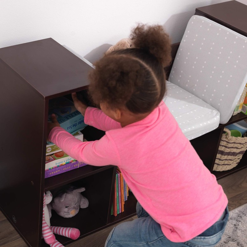 KidKraft Wooden Bookcase with Reading Nook, Six Shelves and Gray Cushion - Espresso, Gift for Ages 3-8
