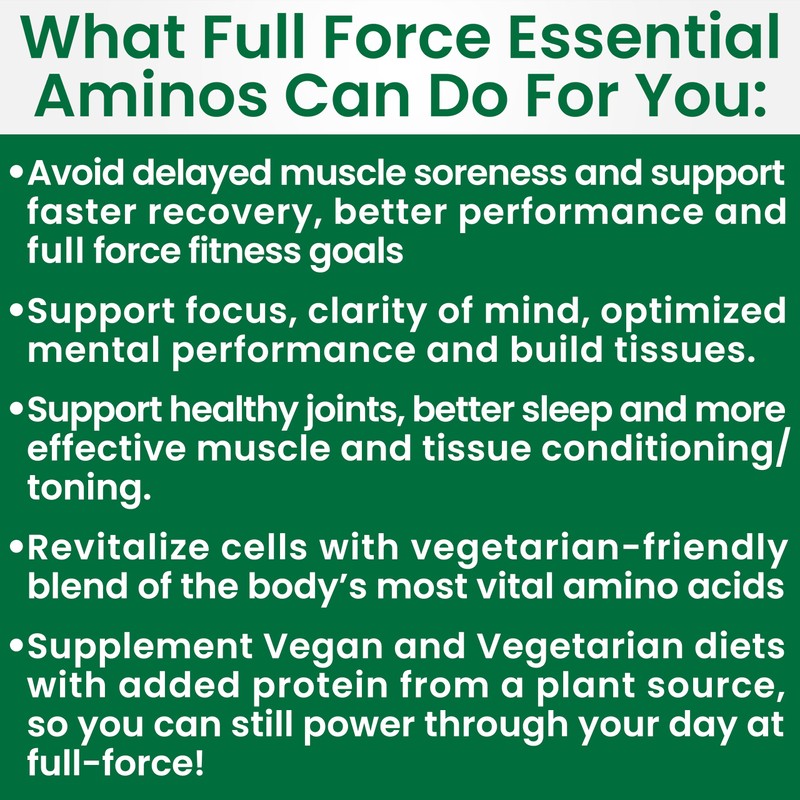 - Full Force Aminos, a comprehensive blend of amino acids, has been meticulously designed for optimal absorption in a free-form amino acid complex. Comprising 9 Essential Amino Acids (EAAs), including Branch Chain Amino Acids (BCAA), Full Force Aminos provides the essential building blocks to support body growth, expedite recovery, alleviate exercise fatigue, enhance cognitive health, boost brain power, and promote restful sleep.
