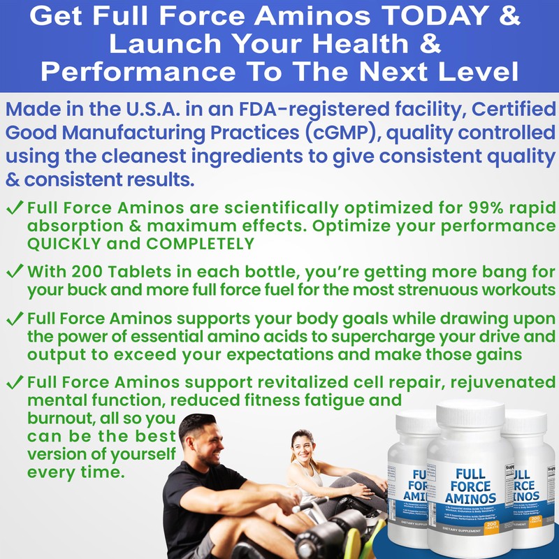 - Full Force Aminos presents a pure formulation in a freeform amino complex that is swiftly digested, supporting the muscular, skeletal, muscle mass, and nervous systems of the body. Ideal for anyone looking to supplement their protein, exercise enthusiasts, and athletes of all types, these amino acids also support brain health and faster recovery. With 200 tablets per bottle manufactured by a cGMP & NSF registered and certified facility, these amino acids are toxin-free.