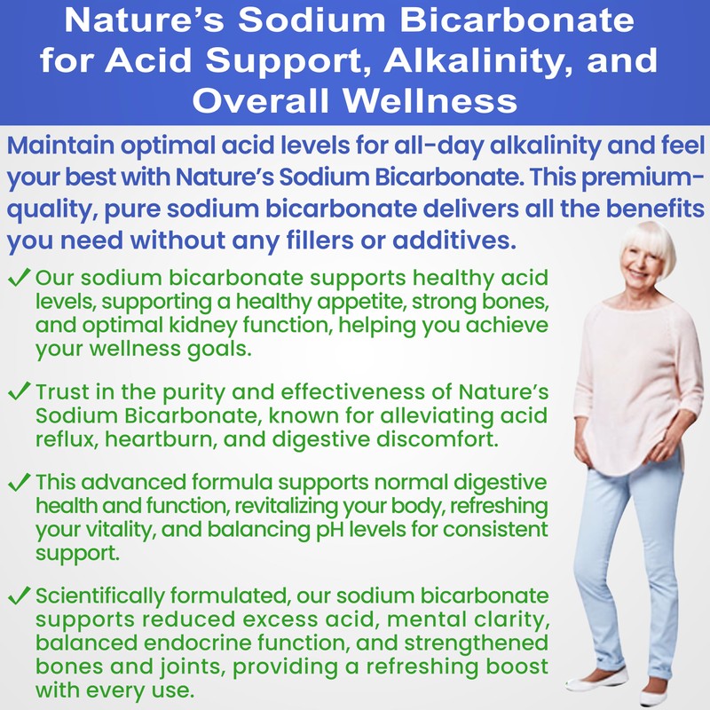- SUPPORT NORMAL DIGESTIVE FUNCTION, ALKALINITY & SO MUCH MORE! Nature's Sodium Bicarbonate powder provides hundreds of benefits with no negatives. An alkalizing supplement that can change your life. Sodium bicarbonate can also help you optimize hydration and is a time-tested antacid. Created by a kidney health sufferer who has experienced excess acid. Formulated in an FDA-registered manufacturing facility using only GMP standards here in the USA. All in a natural powder that's easy to take and super fast-acting for results you can depend on all day long!