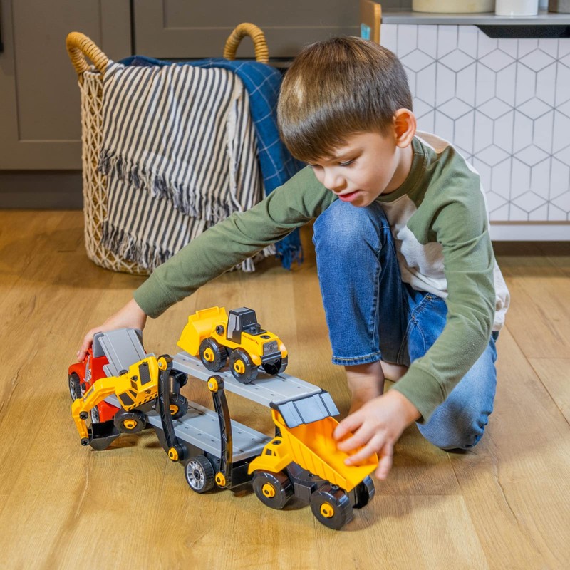 And, when kids are all done playing for the day, the smaller construction vehicles fit nicely into the larger semi toy truck cargo carrier for storage, so no pieces are lost and everything stays organized.