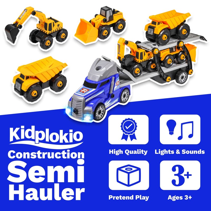 • GIANT ENGINES TOY TRUCK: You and your little ones are about to build the best playtime ever! This Kidplokio full set of construction vehicles will provide hours of DIY construction fun for children ages three and up; kids can change out the equipment of the smaller vehicles, while also play with the semi hauler in separation, slide or transport mode