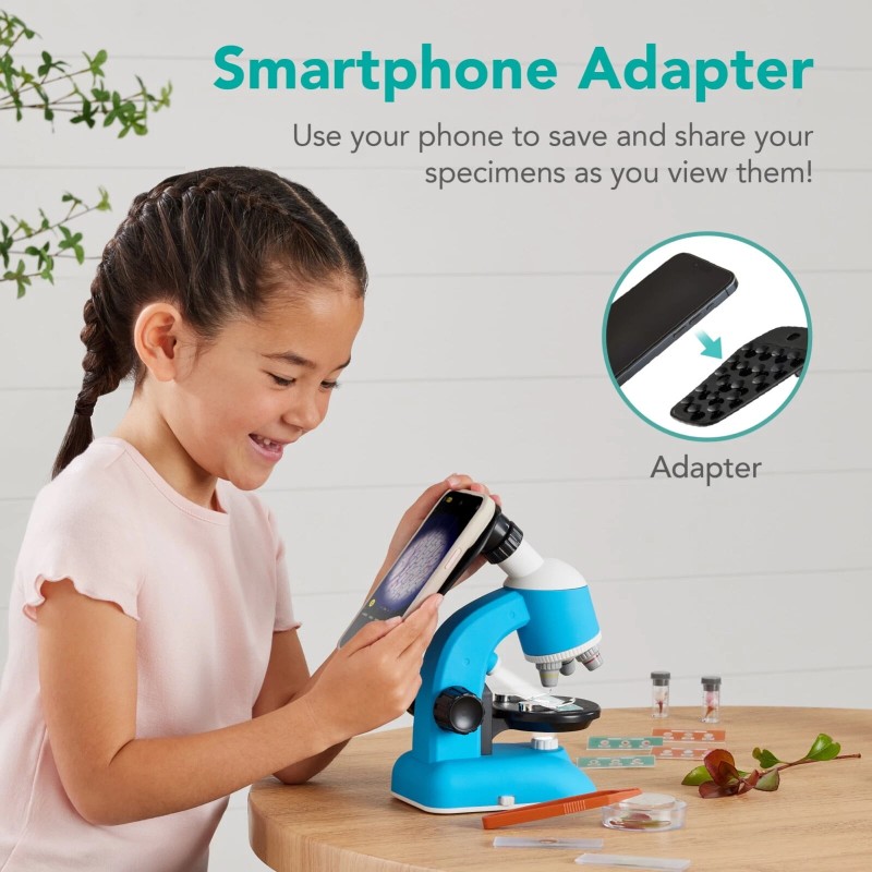 - SMARTPHONE ADAPTER: A simple phone mount is compatible with most models and allows children to use a phone for easy viewing, saving, and sharing of all observable experiments