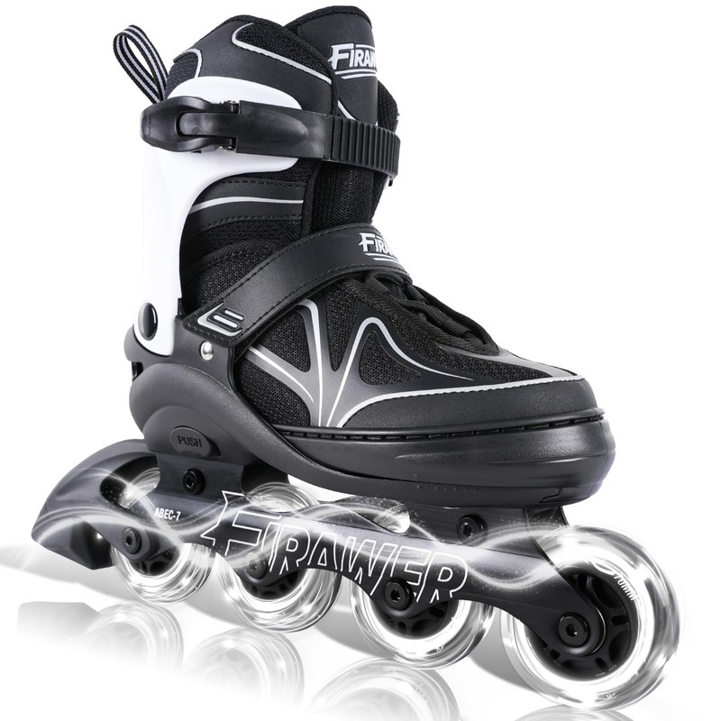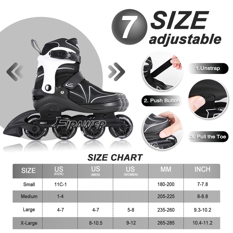 - 【Adjustable Size for Growing Feet】Featuring 7 adjustable sizes, these inline skates allow easy one-button resizing to perfectly fit your child’s foot shape and ankle width. The flexible design ensures a snug, supportive fit for beginners and growing skaters alike.