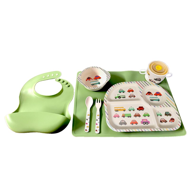 kids bamboo dinnerware set, Toddlers Bamboo Tableware set 8 pcs, Kids Plates set Silicone Bib Placemat, Dinnerware Bamboo Meal Plates for Kids, dish set for children