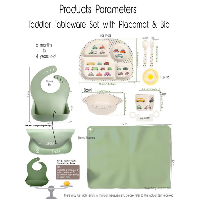 - ONE SET INCLUDES : 1 plate, 1 bowl, 1 cup, 1 cup holder, 1 spoon, 1 fork, 1 silicone bib, and 1 silicone placemat in this toddlers plate set, placemat is durable, easy to clean and with a non-slip design for stability,bib has a deep and sturdy spill pocket that catches any stray food or liquids.