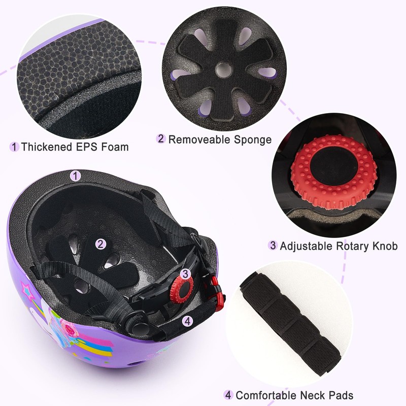 - Comfortable and Breathable: Stay cool during active play with our helmet, which features 11 strategically placed vents for optimal airflow, reducing heat buildup, The knee and elbow pads are made with breathable fabric that helps keep your child comfortable, even during intense physical activity