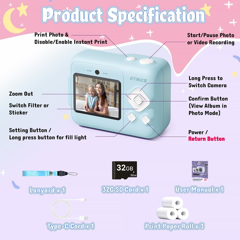 - Complete Kit: Everything is included: 1x kids camera, 3x paper rolls, 32GB SD card, USB-C cable and lanyard. The package includes 3 rolls of printing paper, making your prints more fun! Take as many pictures as you want at anytime,any where, and seize every wonderful moment of joy! A great fit for 4 5 6 7 year old girl birthday gifts