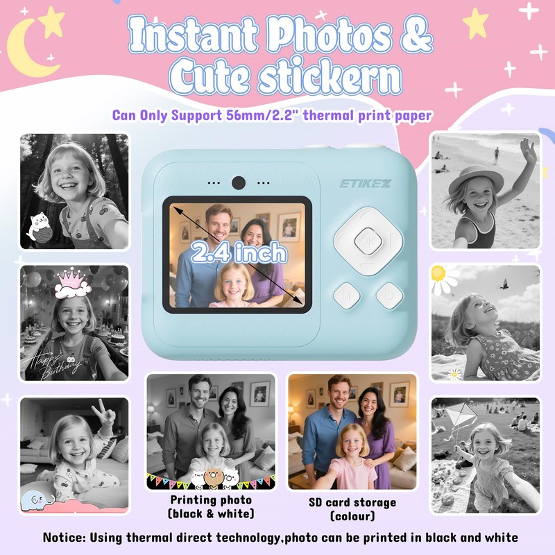 - Multifunctional Camera for Kids: The ETIKEZ kids instant print camera also records 1080P HD videos and includes a 2.4" screen, 6x zoom, flash, games, filters frame, mp3. Kids can experiment with 5 filters and 19 playful frames, making every shot unique. With a front-facing camera, kids can capture and print their own adventures. Long press camera button can switch for front camera. UP/DOWN: filters, stickers. LEFT/RIGHT: zoom—easy enough for a 5 year old girl birthday gift ideas & 5 year old boy birthday gift