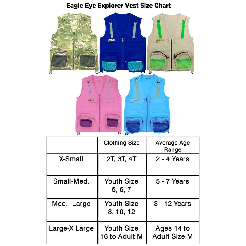 - SAFE - Perfect for Outdoor Activities, Camping, Exploring, Bird Watching, Bug Collecting, Photo Safaris, Fishing, Hiking and Imaginative Adventures of all kinds. Included is one Eagle Eye Explorer cargo vest with reflective safety bands.