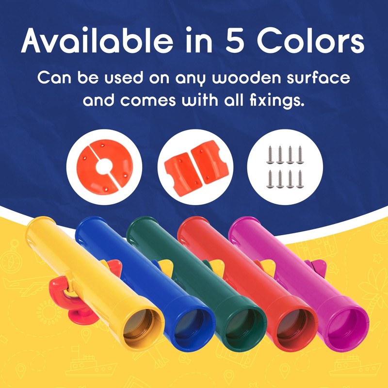 Let your child's imagination soar with this fun and vibrant play telescope, perfect for outdoor adventures on climbing frames, treehouses, and play dens. Designed specifically for little explorers, this bright blue and yellow toy telescope rotates 360 degrees, adding a realistic touch to any adventure. Whether your child is pretending to sail the high seas as a pirate or exploring hidden treehouses, this telescope makes an ideal addition to any toddler climbing frame or garden play structure. While it doesn’t magnify, it offers hours of creative and imaginative play. This durable, weather-resistant toy is a fantastic accessory for children’s outdoor setups, and it can be easily mounted to any climbing frame or playhouse. Built with little hands in mind, it's perfect for toddlers aged 1-6, helping them develop coordination and social play skills. Key Features: *360° Rotation – The telescope smoothly turns 360 degrees, adding an interactive feature to any climbing frame, treehouse, or play den, enhancing imaginative play. *Durable & Safe – Made from sturdy, weather-resistant plastic, perfect for outdoor use on garden climbing frames and treehouses. *Simple Installation – Easily mounts onto a variety of structures such as toddler climbing frames, treehouse toys, and outdoor play dens. *Imaginative Play – A perfect addition to pirate-themed play or any outdoor adventure, encouraging active, imaginative outdoor fun. *Non-Magnifying Toy – While this is a toy and does not magnify, it still allows children to pretend and explore in their outdoor spaces.