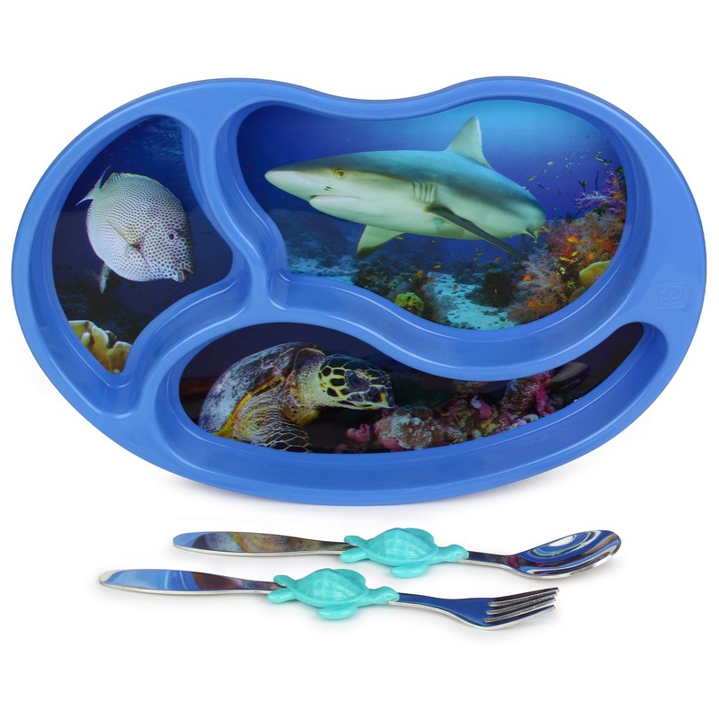 KidsFunwares Blue Ocean Me Time Meal Set, Portion Control Divided Plate with Fork and Spoon for Kids