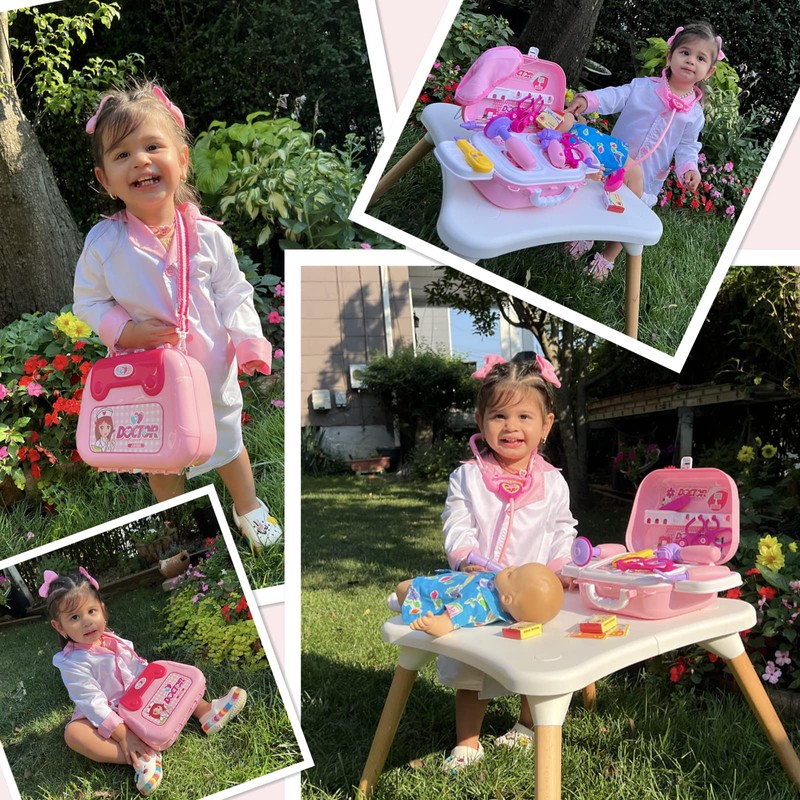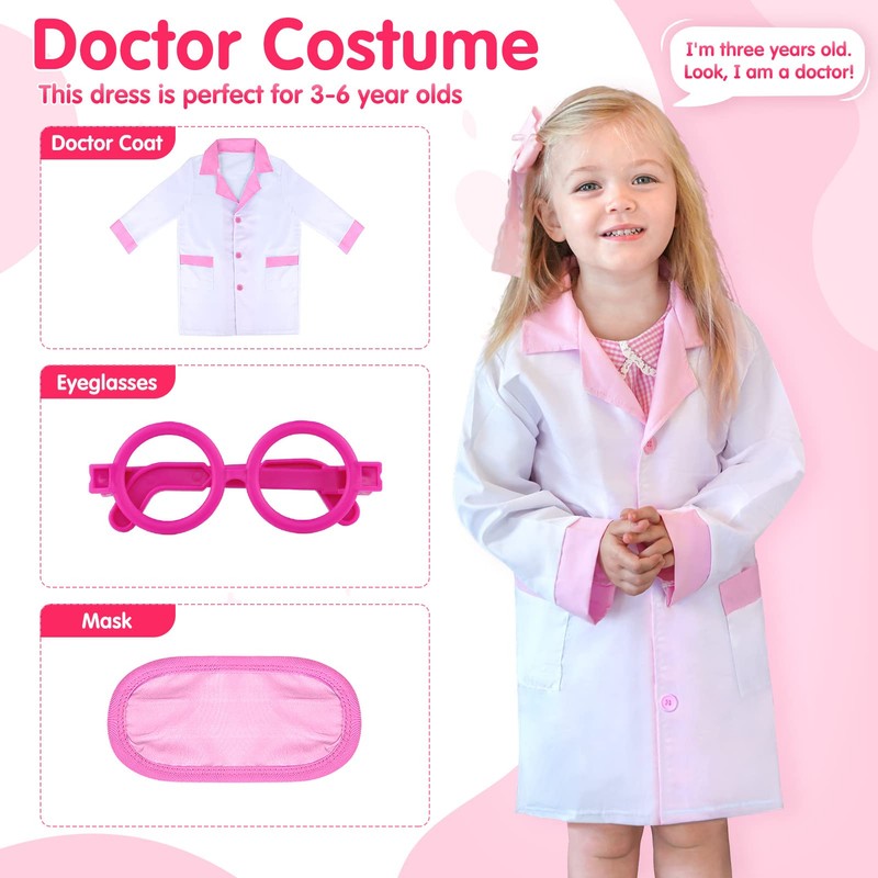 - Pink Doctor Costume Kit & Realistic Sound Effects - With a doctor coat and mask make this pretend game dr kit more realistic and fun! The jacket even has pockets to keep all the essentials close at hand. A stethoscope can make a heartbeat sound (emulation). This toy can not only bring the fun of dressing up, but also help children overcome the fear of seeing a doctor and learn more about medical knowledge.