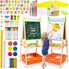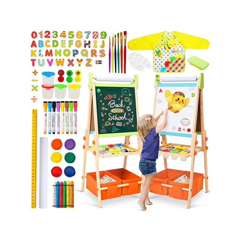 Kids Easel Including 100+ Accessories, Rundad Double Sided Wooden Easel for Kids Age 3-8 with Magnetic Chalkboard & Painting Board, Free Height Adjustable Art Easel Supplies for Toddlers