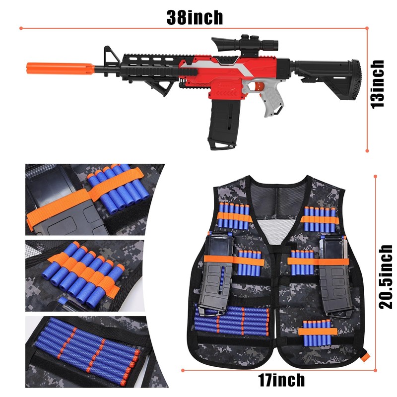 - Lots of Tactical Accessories: Our Dart gun comes with many accessories for more fun. The tactical vest looks cool and helps you carry more bullets and clips. 100 official darts and 2 high capacity magazines for you to fire as you want. Goggles and mask protect your face and eyes from hurt