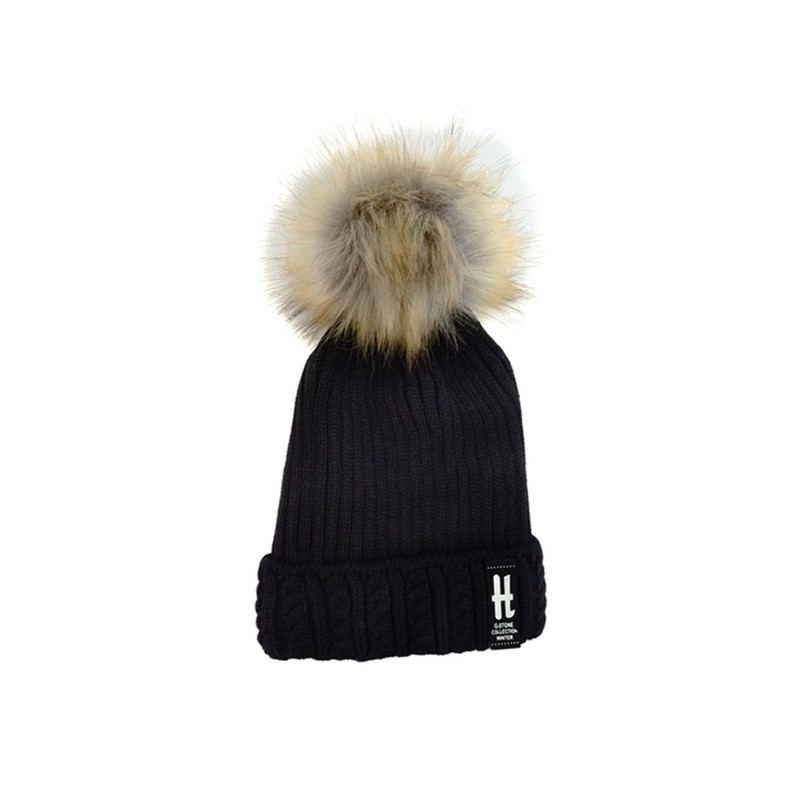 Kids Fur Pom Pom Black Knit Winter Beanie Ski Cap for Boys Girls